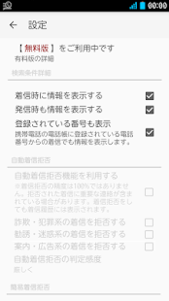 電話帳ナビをインストールしたら「設定」画面で、その携帯電話に「登録されている番号も表示」するか、「不在着信後も表示を残す」か、「アイコンを常に表示」するかどうかを選択します。表示位置や文字サイズも好みで設定できます。ユーザー登録も可能ですが、登録しなくても電話番号に関する情報を表示するサービスは利用できます。